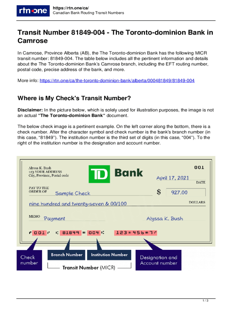 HTTPS://rtn.one/ca/ Canadian Bank Routing Transit NumbersTransit Number 81849004 The Toronto dominion Bank in Cam rose, Province Alberta (AB), the Toronto dominion Bank has the following MICR transit