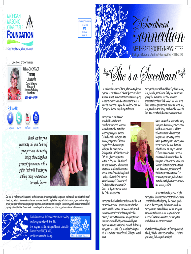 SweetheartSWEETHEART SOCIETY NEWSLETTER1200 Wright Ave, Alma, MI 48801M i c h i g an n M an s o n i c C h an r i t a b l e FO