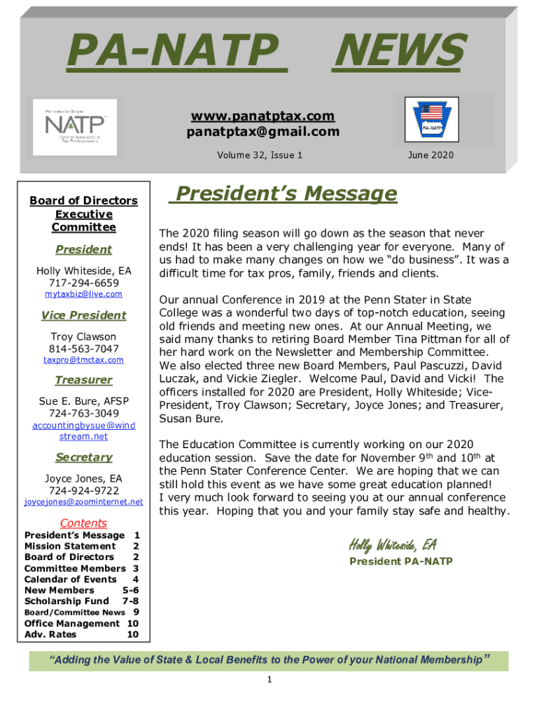 PANATPNEWSwww.panatptax.com panatptax@gmail.com Volume 32, Issue 1Board of Directors Executive Committee President Holly White side, EA 7172946659 mytaxbiz@live.comVice President Troy Clawson 8145637047
