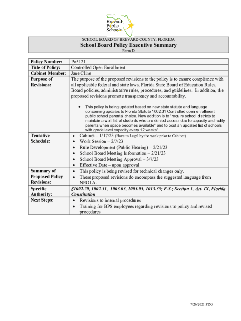 SCHOOL BOARD OF BREVARD COUNTY, FLORIDASchool Board Policy Executive Summary Form Policy Number: Title of Policy: Cabinet Member: Purpose of Revisions:Po5121 Controlled Open Enrollment Jane Cline