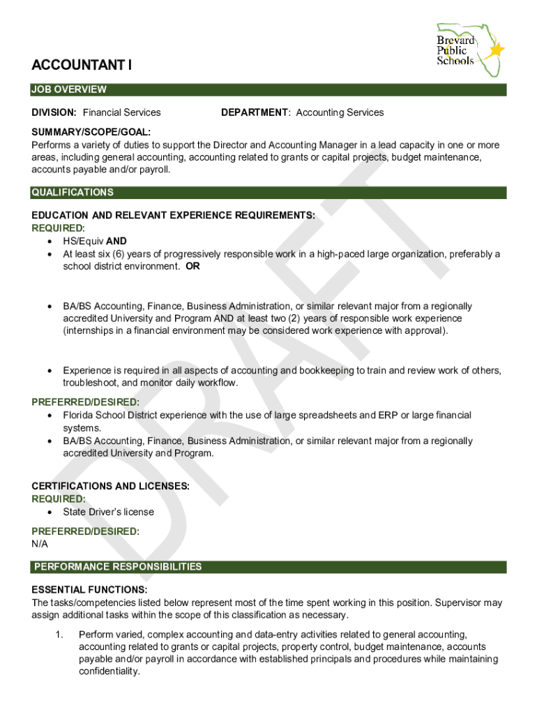 ACCOUNTANT I JOB OVERVIEW DIVISION: Financial ServicesDEPARTMENT: Accounting ServicesSUMMARY/SCOPE/GOAL: Performs a variety of duties to support the Director and Accounting Manager in a lead capacity