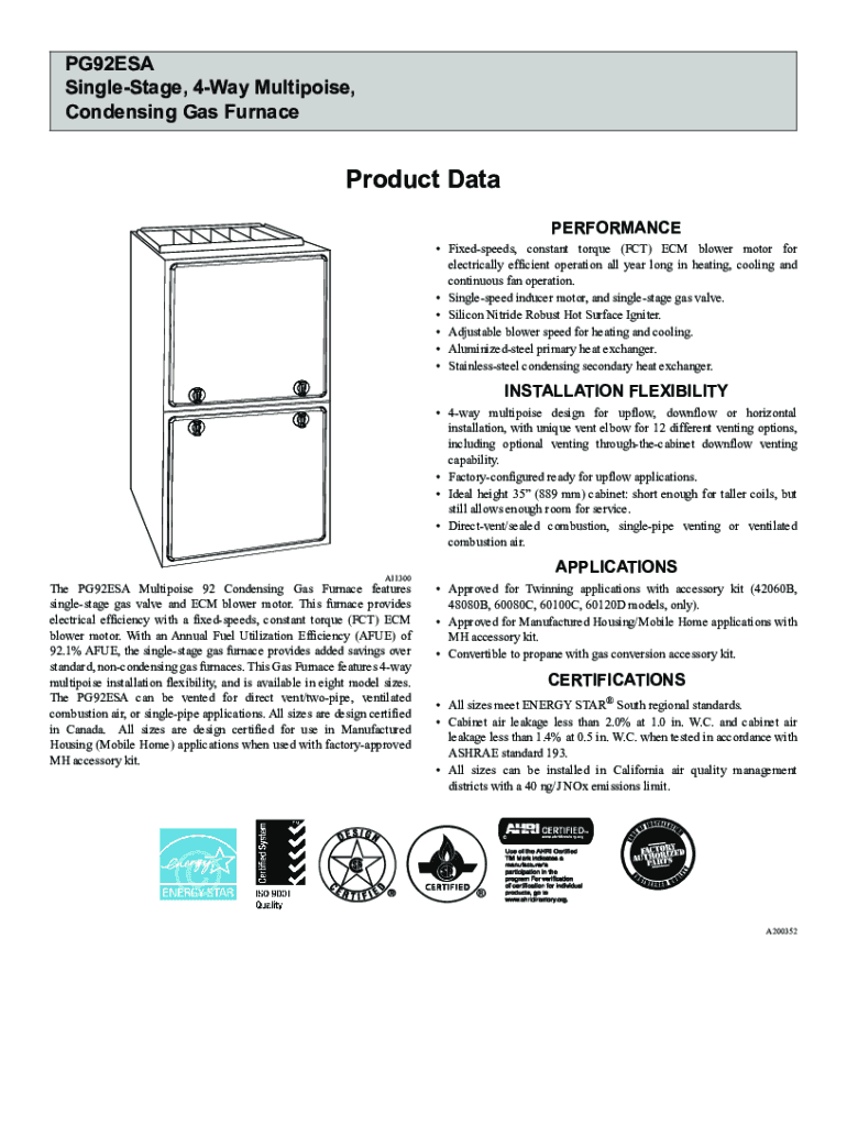 PG92ESA Singletree, 4Way Multi poise, Condensing Gas FurnaceProduct Data PERFORMANCE Fixed speeds, constant torque (ACT) ECM blower motor for electrically efficient operation all year long in heating,