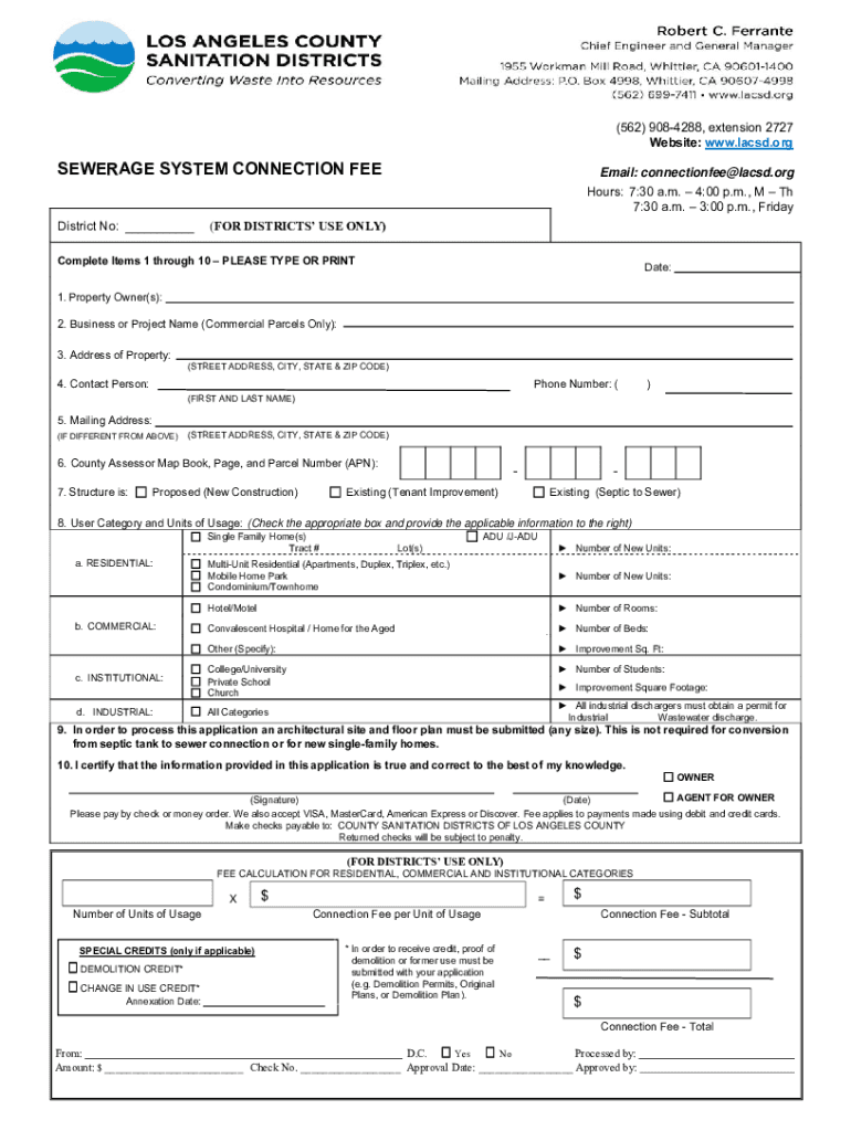 (562) 9084288, extension 2727 Website: www.lacsd.orgSEWERAGE SYSTEM CONNECTION Federal: connectionfee@lacsd.org Hours: 7:30 a.m. 4:00 p.m., M The 7:30 a.m. 3:00 p.m., FridayDistrict No: ___(FOR DISTRICTS