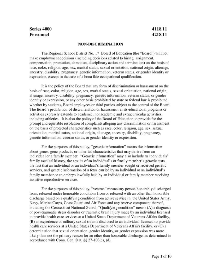 Series 4000 Personnel4118.11 4218.11 Nondiscrimination Regional School District No. 17 Board of Education (the Board) will not make employment decisions (including decisions related to hiring, assignment,