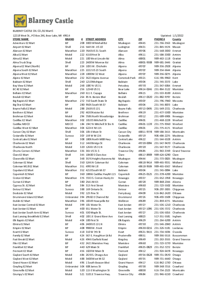 Get the free BLARNEY CASTLE OIL CO./EZ MartS 12218 West St., PO Box 246 ...