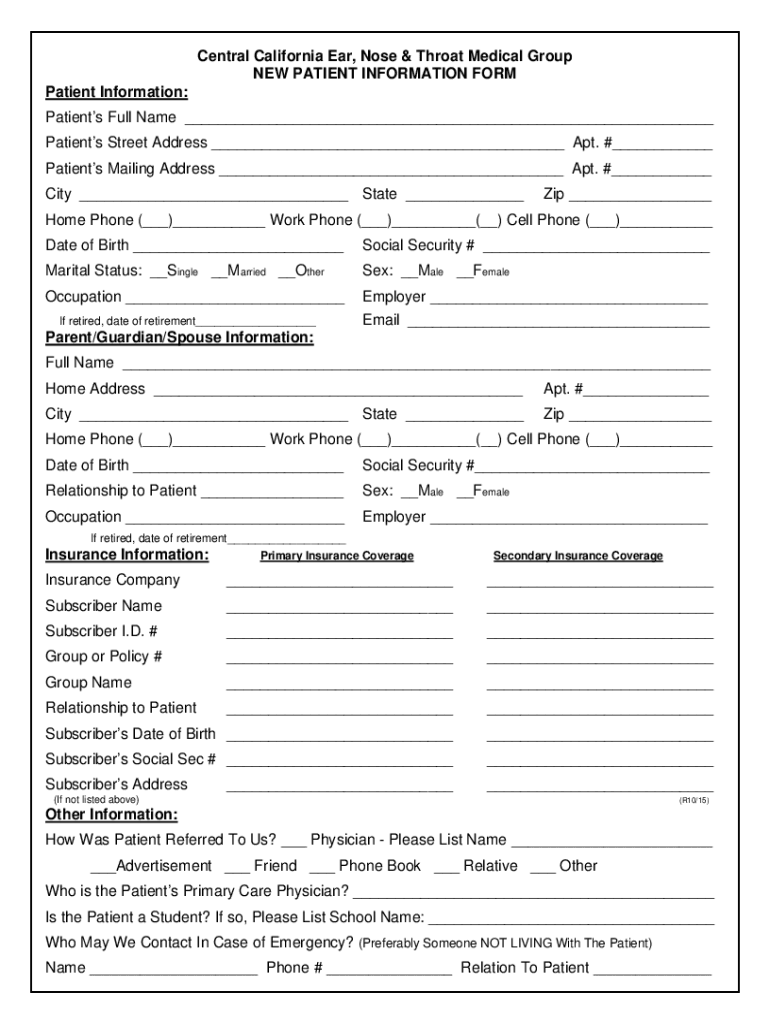 Central California Ear, Nose & Throat Medical Group NEW PATIENT INFORMATION FORM Patient Information: Patients Full Name ___ Patients Street Address ___ Apt. #___ Patients Mailing Address ___ Apt.
