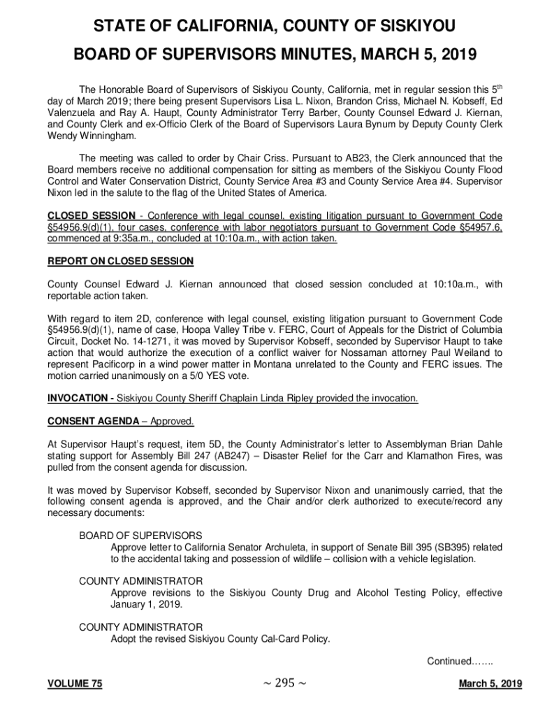 STATE OF CALIFORNIA, COUNTY OF MISKITO BOARD OF SUPERVISORS MINUTES, MARCH 5, 2019, The Honorable Board of Supervisors of Miskito County, California, met in regular session this 5th day of March 2019;