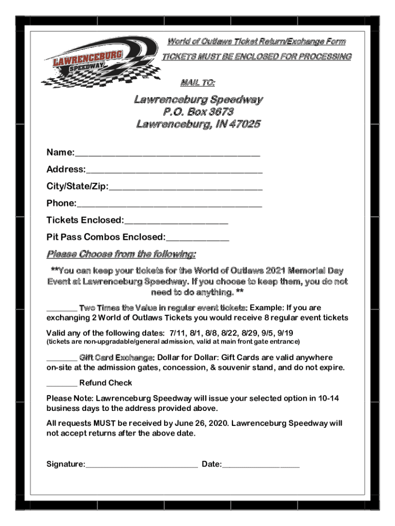 World of Outlaws Ticket Return/Exchange Form TICKETS MUST BE ENCLOSED FOR PROCESSING MAIL TO:Lawrence burg Speedway P.O. Box 3673 Lawrence burg, IN 47025 Name:___ Address:___ City/State/Zip:___ Phone:___