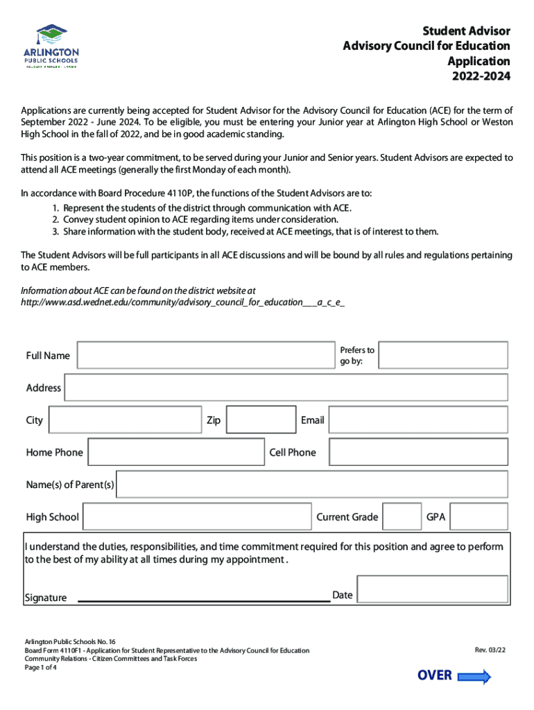 Student Advisor Advisory Council for Education Application 20222024 Applications are currently being accepted for Student Advisor for the Advisory Council for Education (ACE) for the term of September