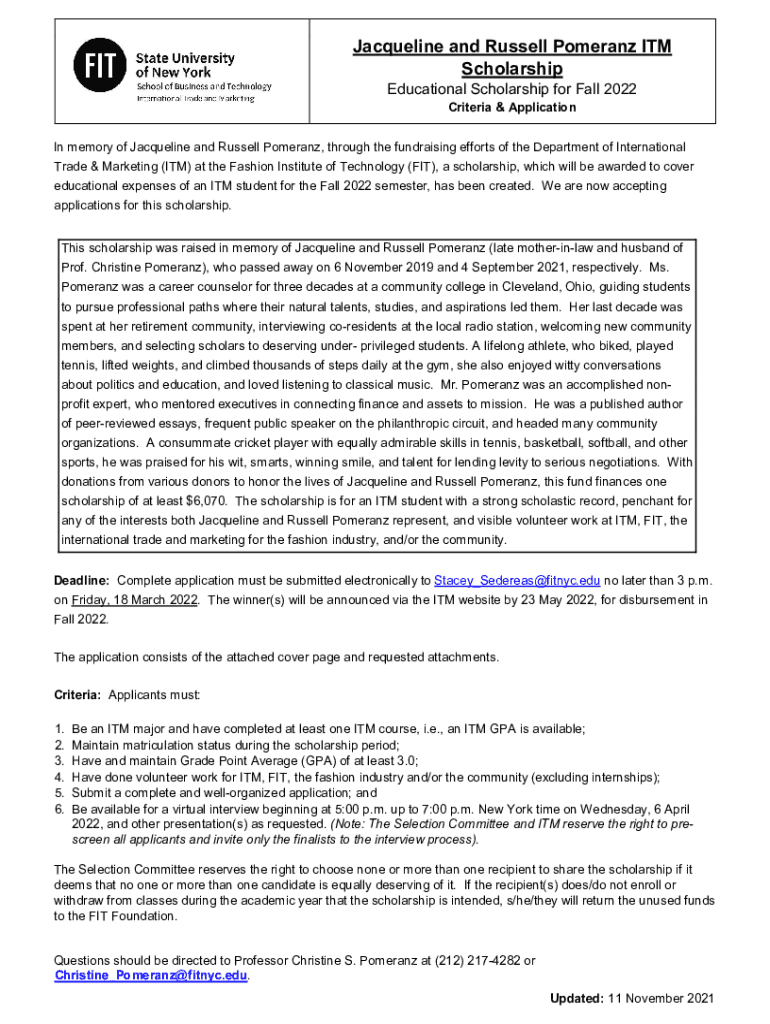 Get the free Jacqueline and Russell Pomeranz ITM Scholarship