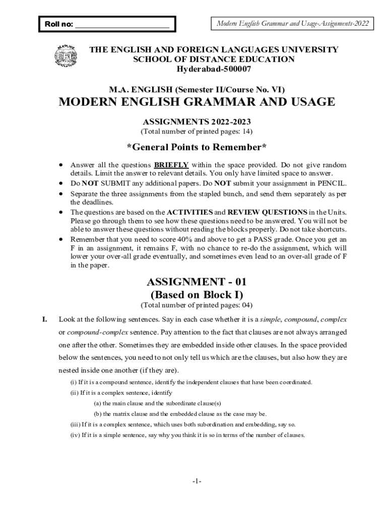 Modern English Grammar and UsageAssignments2022Roll no: ___THE ENGLISH AND FOREIGN LANGUAGES UNIVERSITY SCHOOL OF DISTANCE EDUCATION Hyderabad500007 M.A. ENGLISH (Semester II/Course No. VI)MODERN