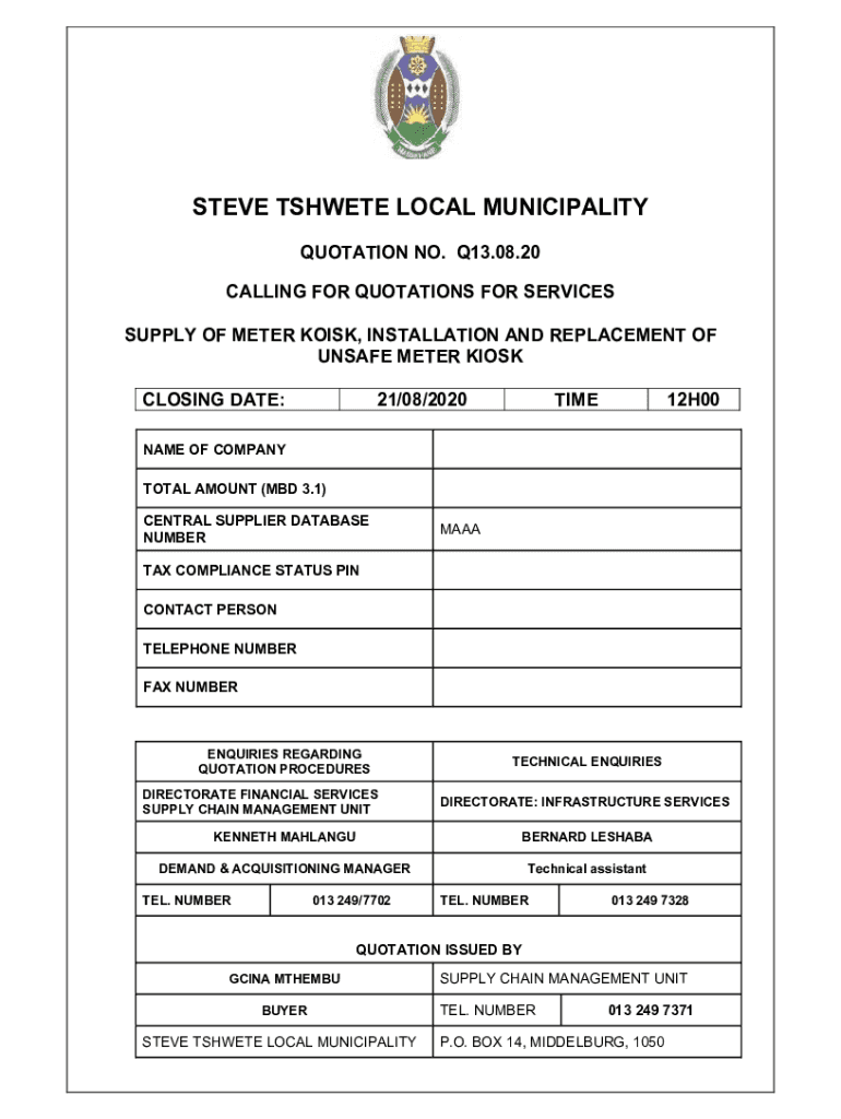 STEVE THERE LOCAL MUNICIPALITY QUOTATION NO. Q13.08.20 CALLING FOR QUOTATIONS FOR SERVICES SUPPLY OF METER KO ISK, INSTALLATION AND REPLACEMENT OF UNSAFE METER KIOSK CLOSING DATE:21/08/2020TIME12H00NAME
