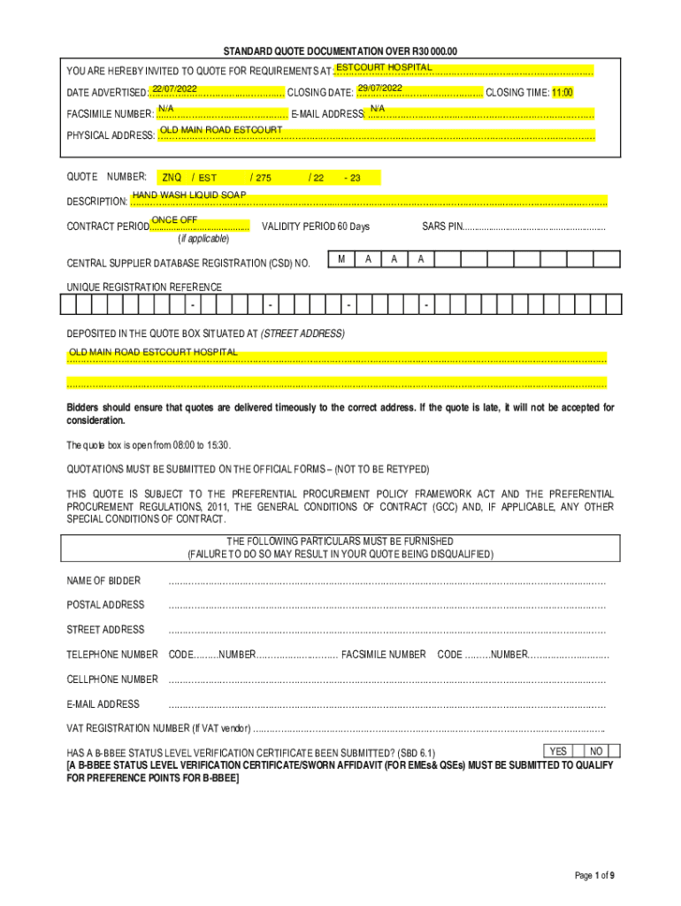 STANDARD QUOTE DOCUMENTATION OVER R30 000.00 ESCORT HOSPITAL YOU ARE HEREBY INVITED TO QUOTE FOR REQUIREMENTS AT:.29/07/2022 22/07/2022 DATE ADVERTISED:... CLOSING DATE: ... CLOSING TIME: 11:00 N/AN/FACSIMILE
