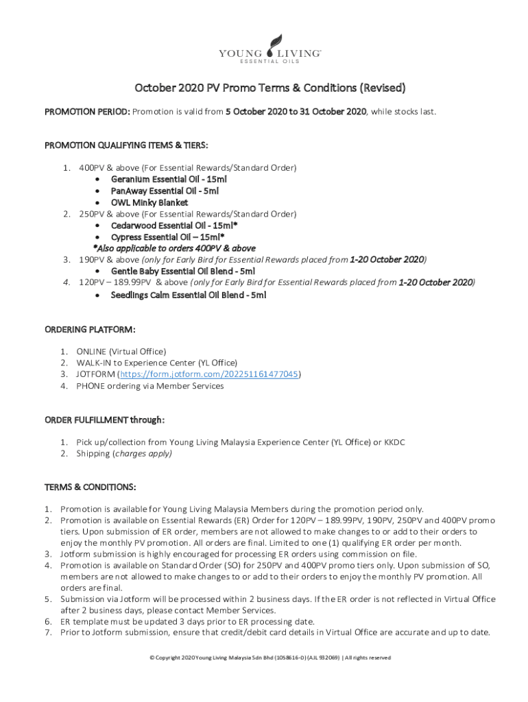 October 2020 PV Promo Terms & Conditions (Revised) PROMOTION PERIOD: Promotion is valid from 5 October 2020 to 31 October 2020, while stocks last. PROMOTION QUALIFYING ITEMS & TIERS: 1. 400PV & above