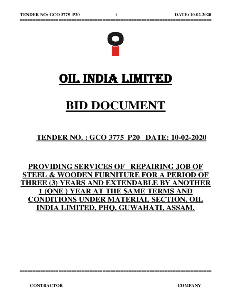 TENDER NO: GO 3775 P20 1 DATE: 10022020 OIL INDIA LIMITED BID DOCUMENT TENDER NO. GO 3775 P20 DATE: 10022020PROVIDING SERVICES OF REPAIRING JOB OF STEEL & WOODEN FURNITURE FOR A PERIOD OF THREE (3)