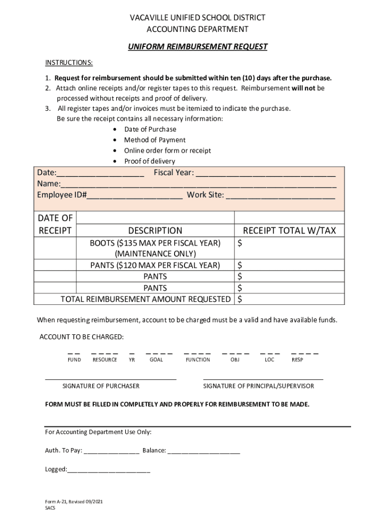VACAVILLE UNIFIED SCHOOL DISTRICT ACCOUNTING DEPARTMENT UNIFORM REIMBURSEMENT REQUEST INSTRUCTIONS: 1. Request for reimbursement should be submitted within ten (10) days after the purchase. 2. Attach