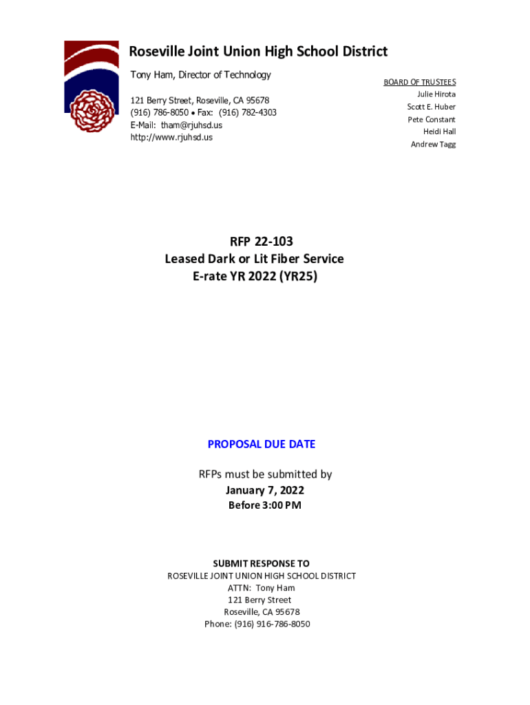 Roseville Joint Union High School District Tony Ham, Director of Technology 121 Berry Street, Roseville, CA 95678 (916) 7868050 Fax: (916) 7824303 Email: tham@rjuhsd.us http://www.rjuhsd.usRFP 22103