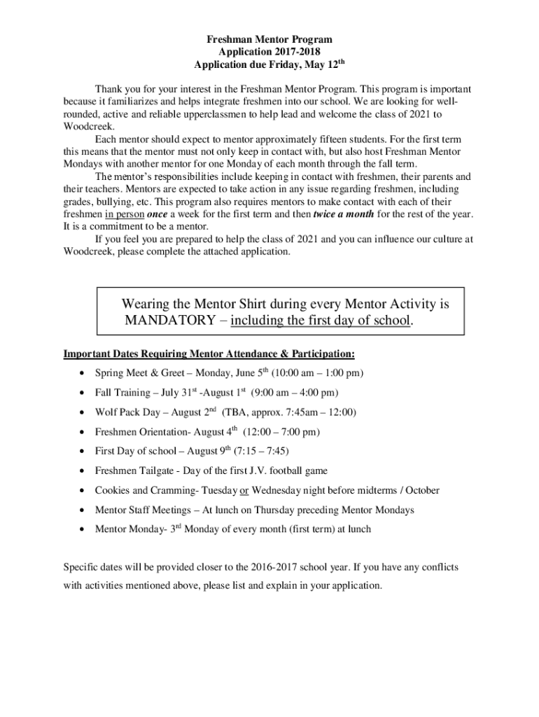 Freshman Mentor Program Application 20172018 Application due Friday, May 12th Thank you for your interest in the Freshman Mentor Program. This program is important because it familiarizes and helps