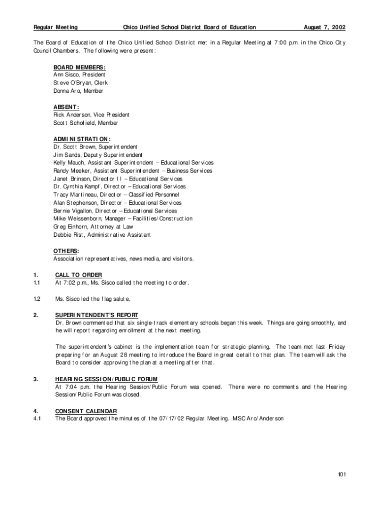 Regular Meeting Chico Unified School District Board of Education August 7, 2002The Board of Education of the Chico Unified School District met in a Regular Meeting at 7:00 p.m. in the Chico City Council
