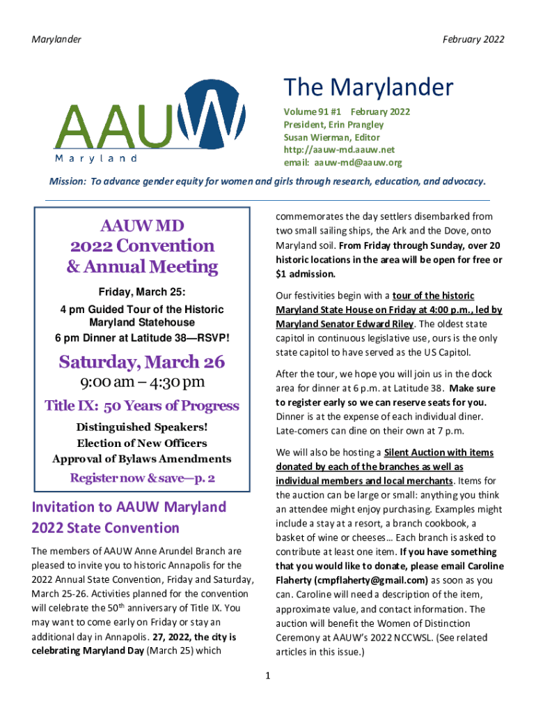 Marylander February 2022The Marylander Volume 91 #1 February 2022 President, Erin Langley Susan German, Editor http://aauwmd.aauw.net email: aauwmd@aauw.orgMission: To advance gender equity for women