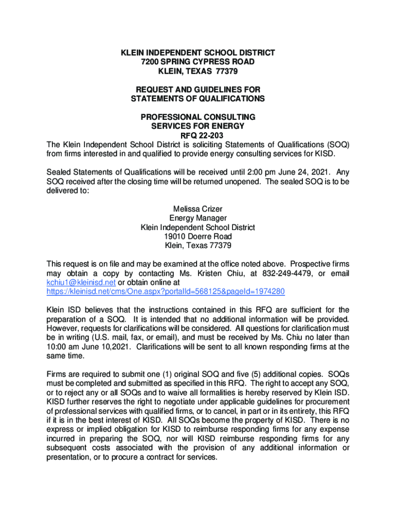KLEIN INDEPENDENT SCHOOL DISTRICT 7200 SPRING CYPRESS ROAD KLEIN, TEXAS 77379 REQUEST AND GUIDELINES FOR STATEMENTS OF QUALIFICATIONS PROFESSIONAL CONSULTING SERVICES FOR ENERGY RFQ 22203 The Klein