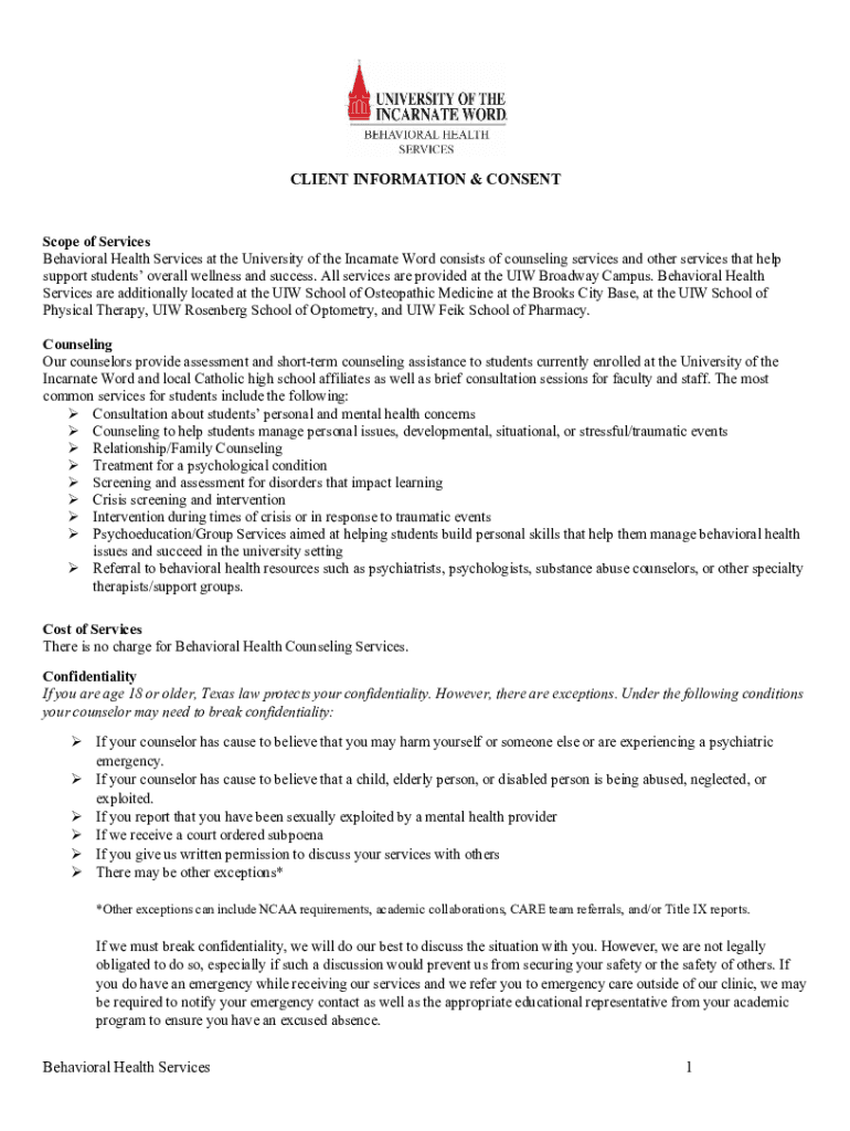 CLIENT INFORMATION & CONSENTS cope of Services Behavioral Health Services at the University of the Incarnate Word consists of counseling services and other services that help support students overall