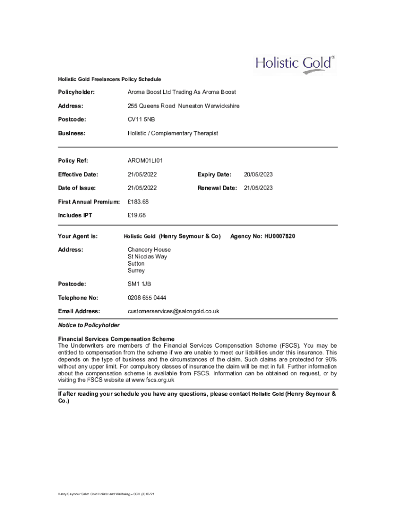 Holistic Gold Freelancers Policy SchedulePolicyholder:Aroma Boost Ltd Trading As Aroma BoostAddress:255 Queens Road Uneaten WarwickshirePostcode:CV11 5NBBusiness:Holistic / Complementary TherapistPolicy