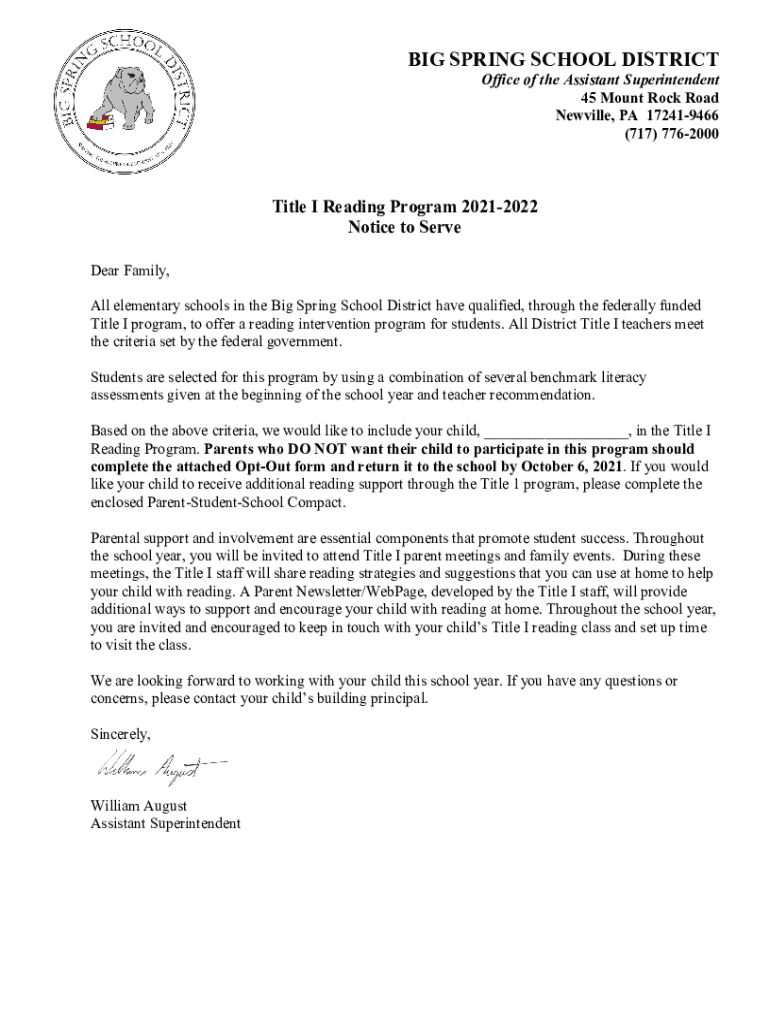 BIG SPRING SCHOOL DISTRICTOffice of the Assistant Superintendent 45 Mount Rock Road Neville, PA 172419466 (717) 7762000Title I Reading Program 20212022 Notice to Serve Dear Family, All elementary