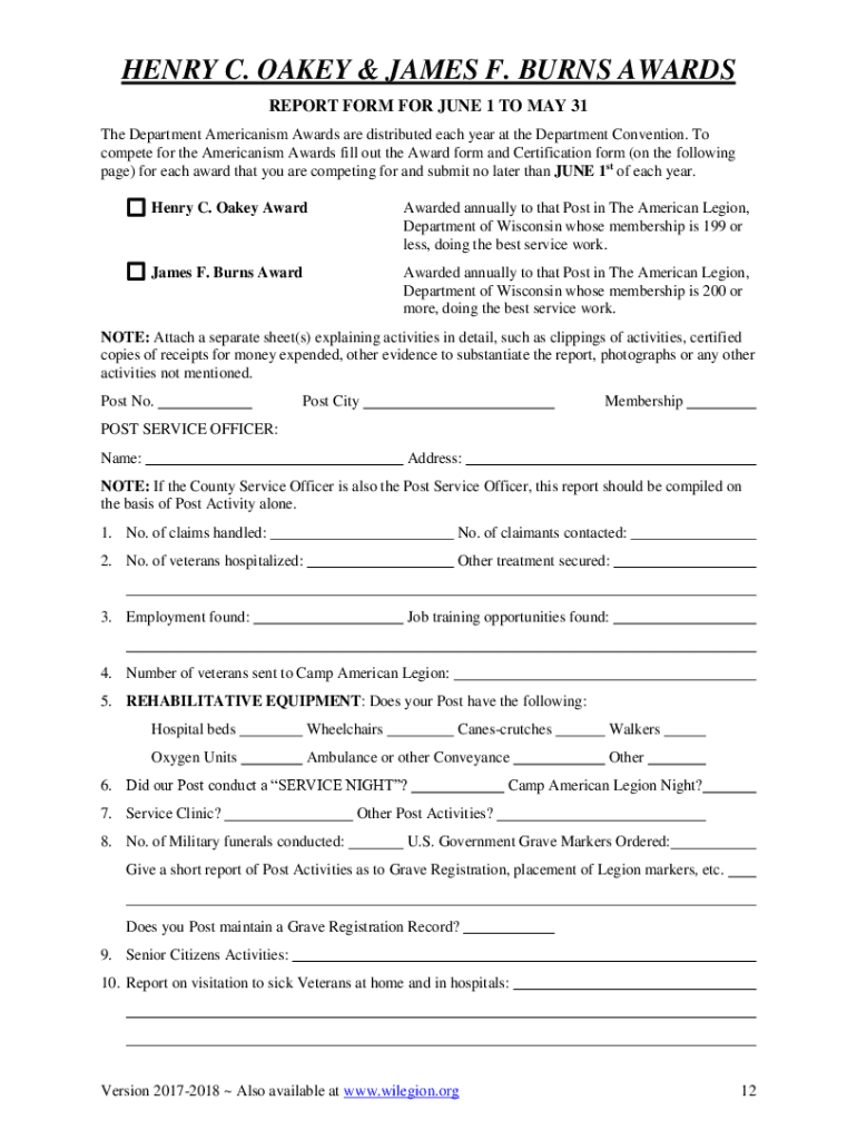 HENRY C. OAKLEY & JAMES F. BURNS AWARDS REPORT FORM FOR JUNE 1 TO MAY 31 The Department Americanism Awards are distributed each year at the Department Convention. To compete for the Americanism Awards