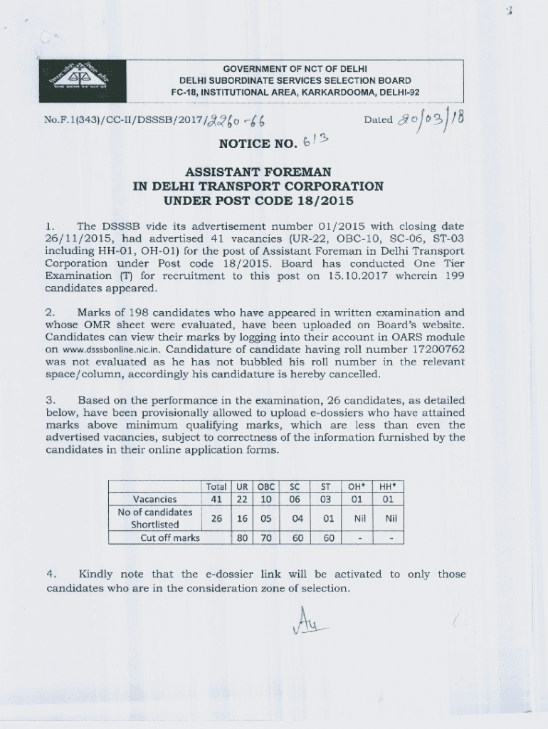 GOVERNMENT OF NCT OF DELHI SUBORDINATE SERVICES SELECTION BOARD FC18, INSTITUTIONAL AREA, KARKARDOOMA, DELHI92No. F.l(343)/CCI/DS SSB/2017/O(BB r[b NOTICE NO. G\' ASSISTANT FOREMAN IN DELHI TRANSPORT