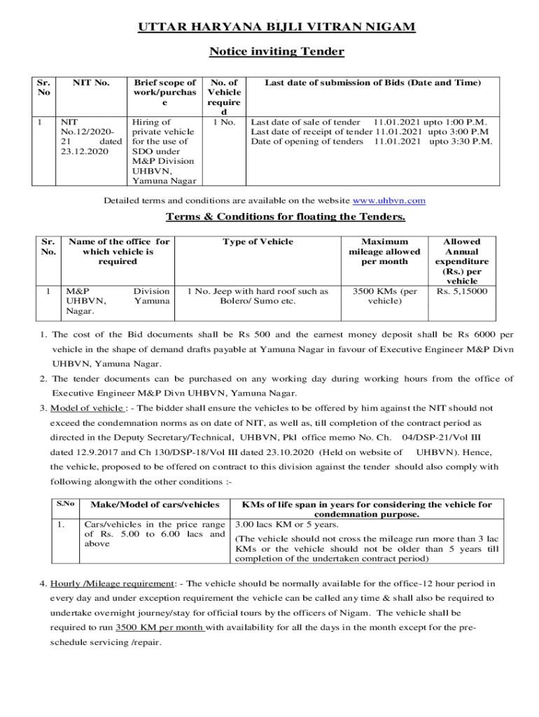 6UTTAR HARYANA BILL VETERAN NI GAM Notice inviting Tender Sr. No1NIT No. Brief scope of work/purchase NIT No.12/202021 dated 23.12.2020Hiring of private vehicle for the use of SDO under M&P Division