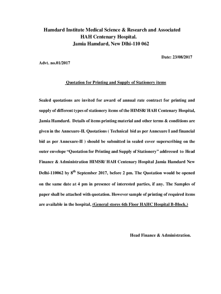 Get the free Quotation for Printing and Supply of Stationery items - HIMSR
