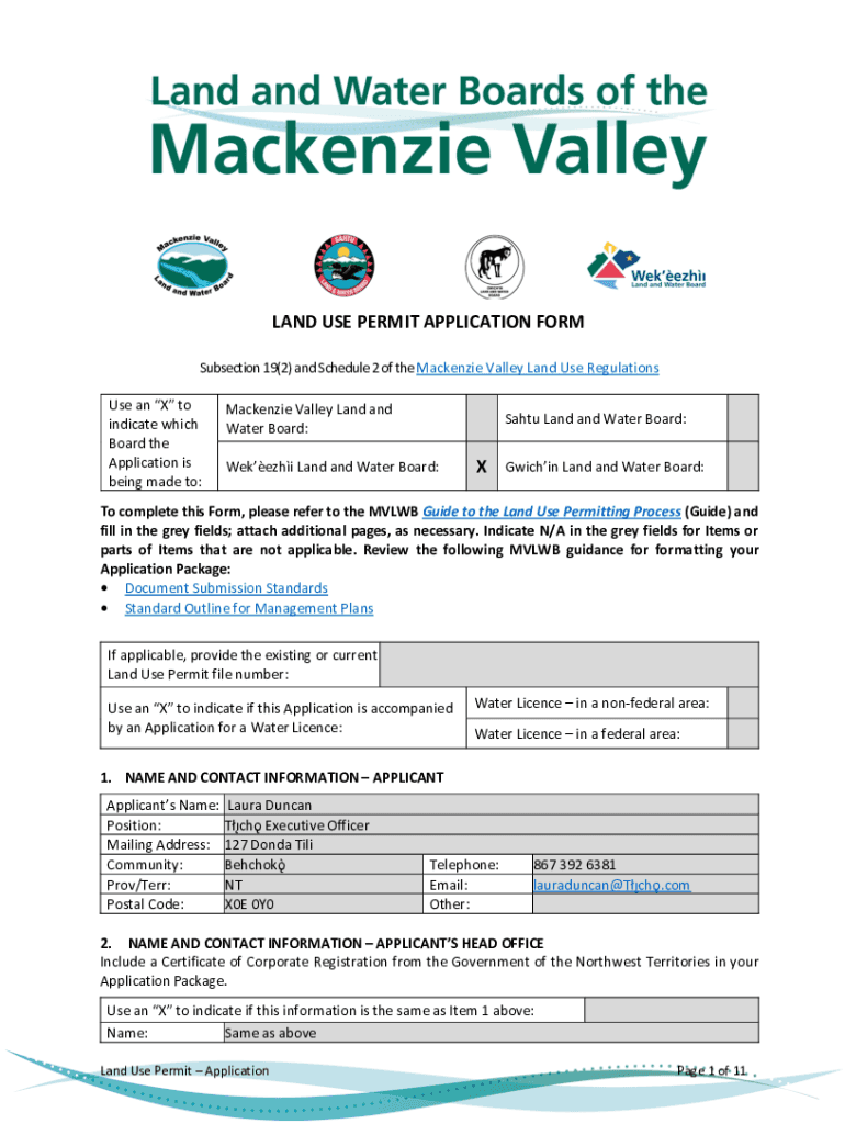 LAND USE PERMIT APPLICATION FORM Subsection 19(2) and Schedule 2 of the Mackenzie Valley Land Use Regulations Use an X to indicate which Board the Application is being made to:Mackenzie Valley Land