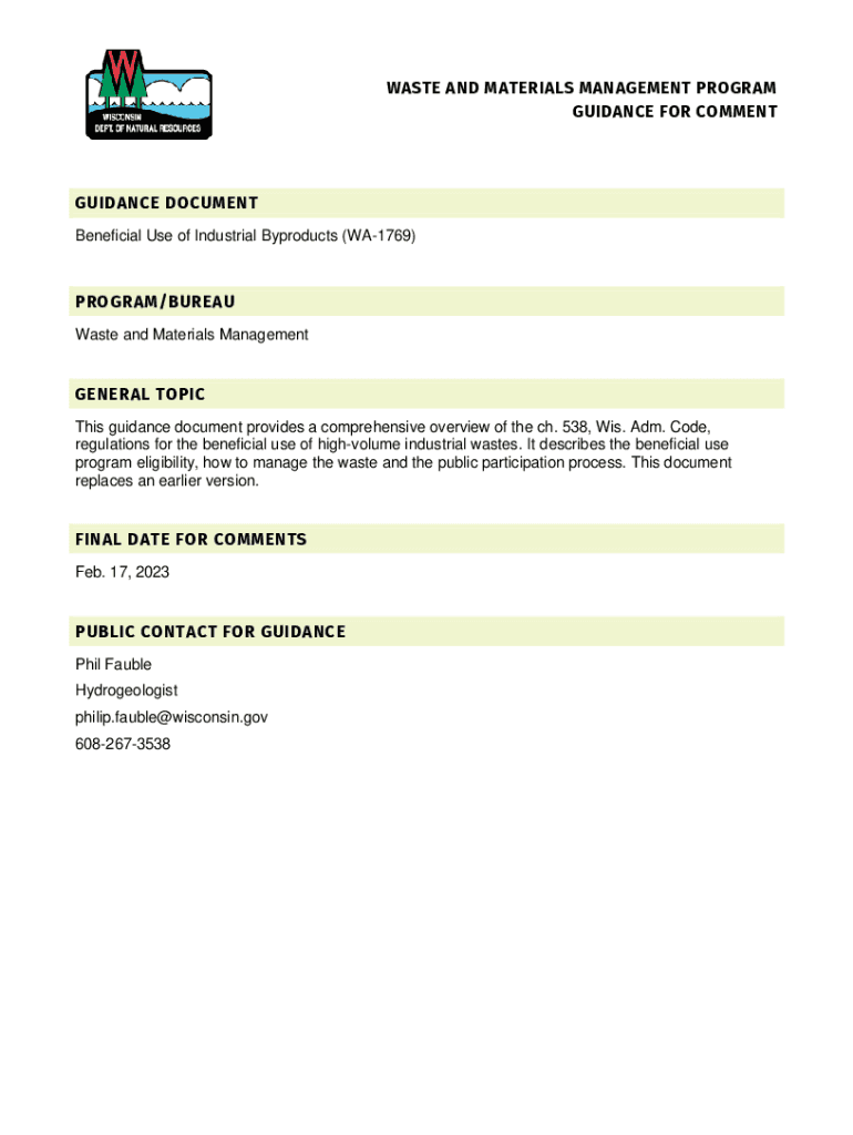 WASTE AND MATERIALS MANAGEMENT PROGRAM GUIDANCE FOR COMMENTGUIDANCE DOCUMENT Beneficial Use of Industrial Byproducts (WA1769)PROGRAM/BUREAU Waste and Materials ManagementGENERAL TOPIC This guidance