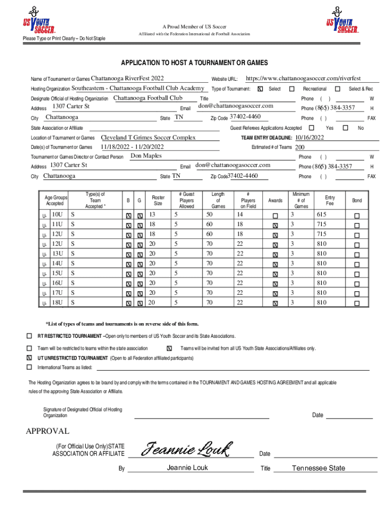 A Proud Member of US Soccer Affiliated with the Federation International de Football AssociationPlease Type or Print Clearly Do Not StapleAPPLICATION TO HOST A TOURNAMENT OR GAMES Name of Tournament