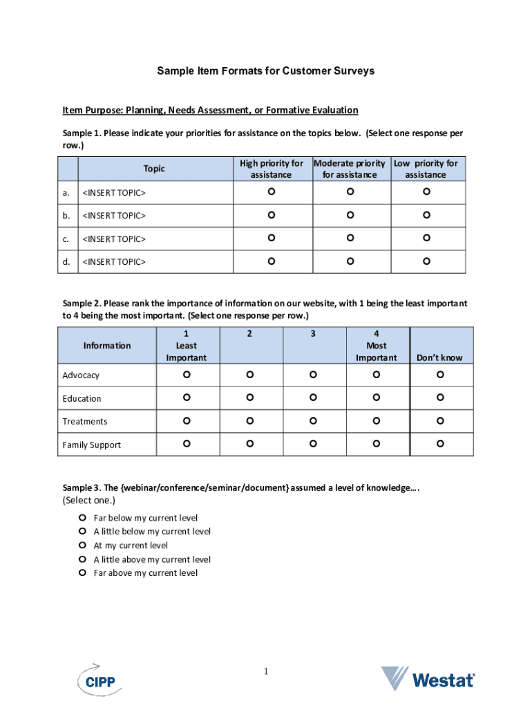 Sample Item Formats for Customer Surveys Item Purpose: Planning, Needs Assessment, or Formative Evaluation Sample 1. Please indicate your priorities for assistance on the topics below. (Select one