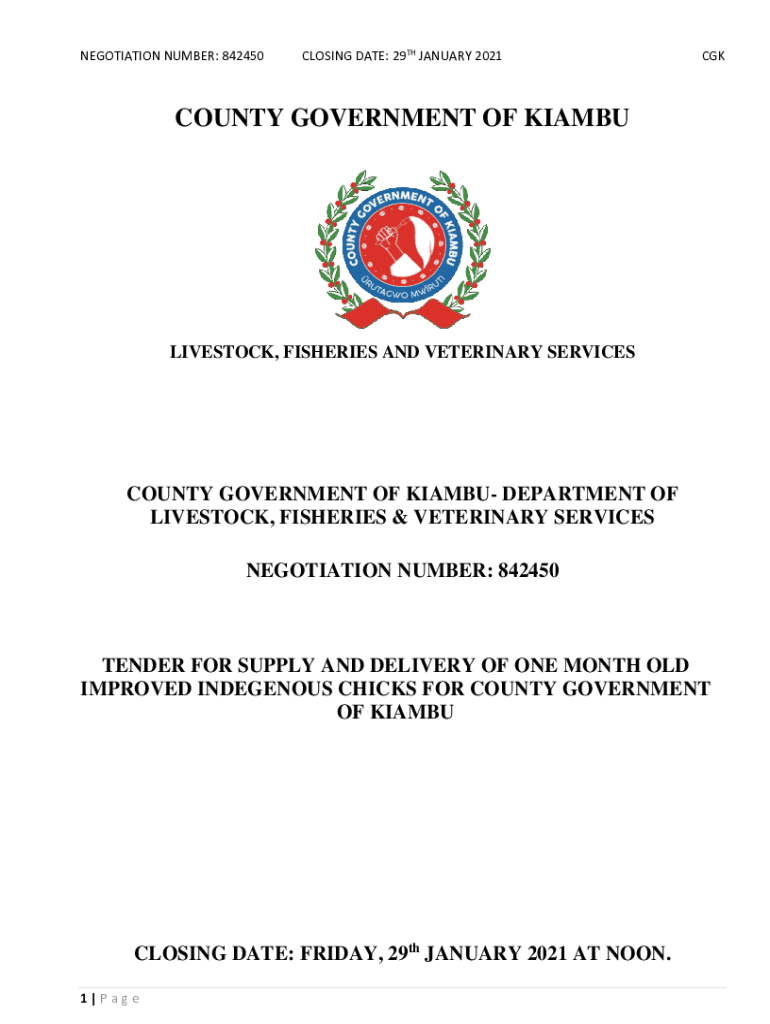 NEGOTIATION NUMBER: 842450CLOSING DATE: 29TH JANUARY 2021CGKCOUNTY GOVERNMENT OF KIAMBULIVESTOCK, FISHERIES AND VETERINARY SERVICESCOUNTY GOVERNMENT OF IAMB DEPARTMENT OF LIVESTOCK, FISHERIES & VETERINARY