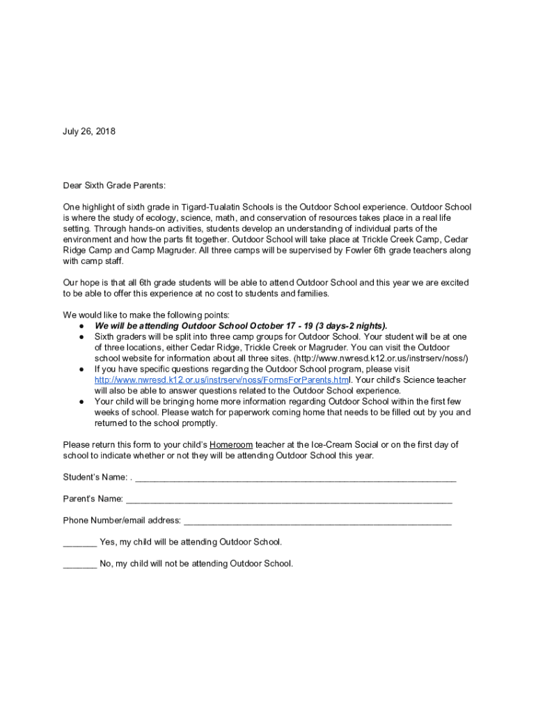 July 26, 2018Dear Sixth Grade Parents: One highlight of sixth grade in Tigard Tualatin Schools is the Outdoor School experience. Outdoor School is where the study of ecology, science, math, and conservation