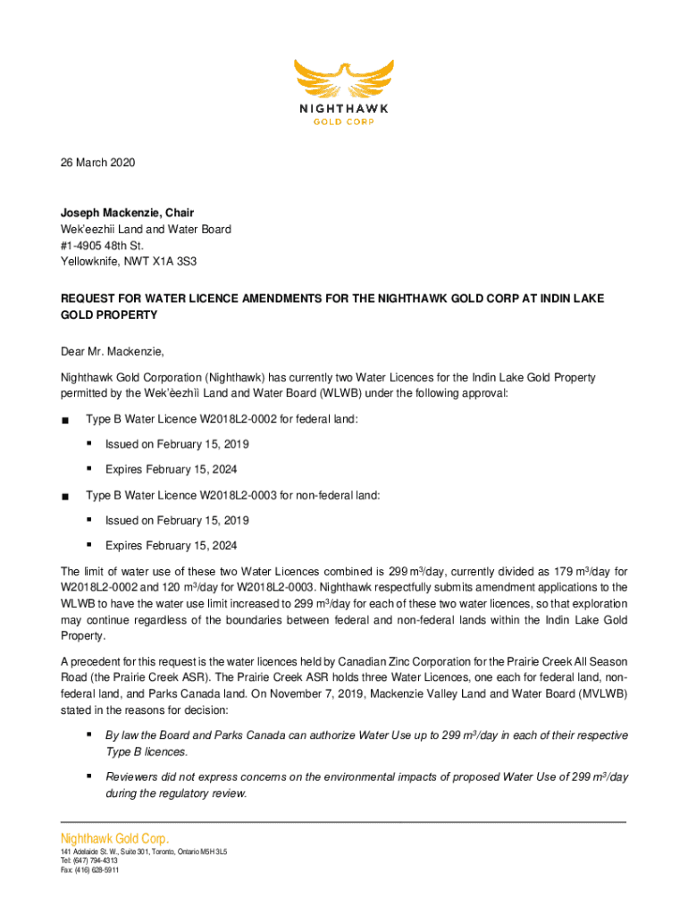 NIGHTHAWK GOLD CORP26 March 2020Joseph Mackenzie, Chair Wekeezhii Land and Water Board #14905 48th St. Yellowknife, NWT X1A 3S3 REQUEST FOR WATER License AMENDMENTS FOR THE NIGHTHAWK GOLD CORP AT