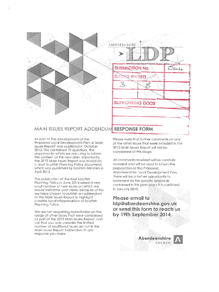 , MAIN ISSUES REPORT ADDENDUM As part of the development of the Proposed Local Development Plan a \” Main Issues Report\” was published in October 2013. This contained 19 questions, the responses