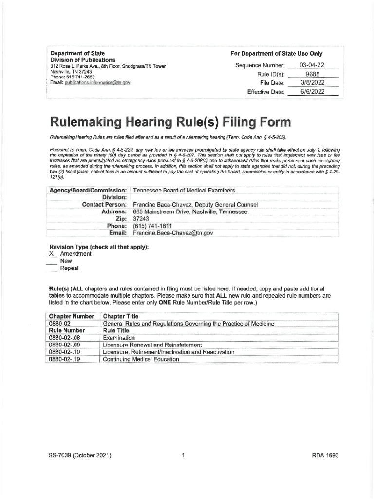 Department of State Division of Publications Department of State Use Only030422 9685 Rule IDs): 3/8/2022 File Date: 6/6/2022 Effective Date:Sequence Number:312 Rosa L. Parks Ave., 8th Floor, Snodgrass/TN
