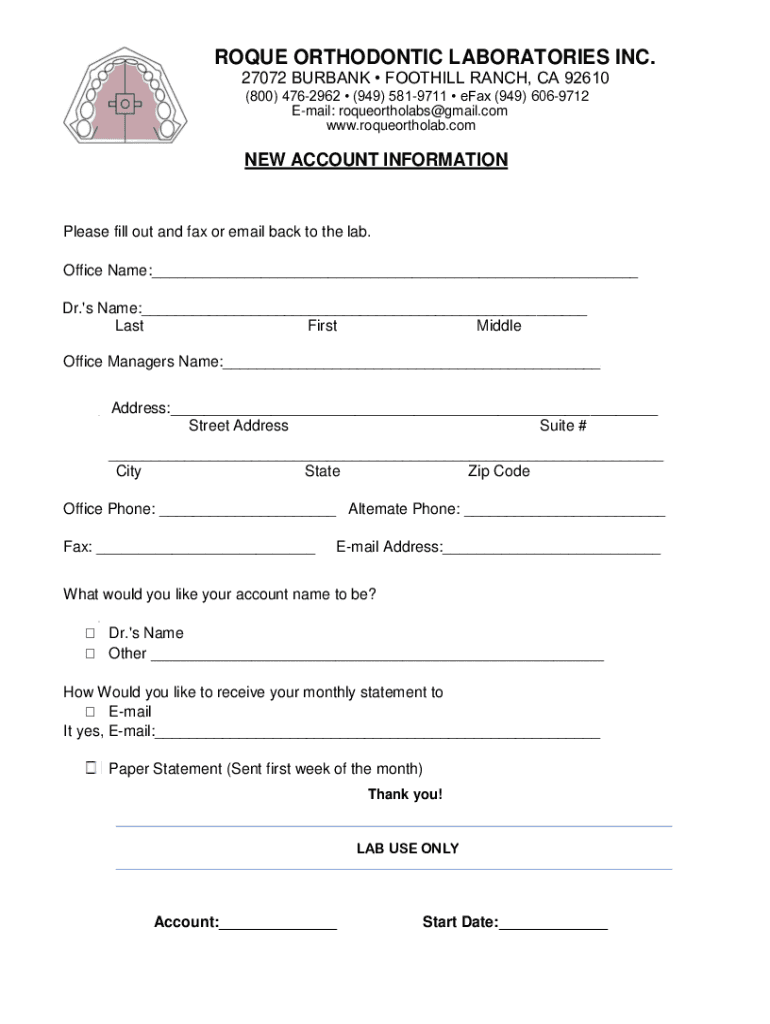 ROQUE ORTHODONTIC LABORATORIES INC. 27072 BURBANK FOOTHILL RANCH, CA 92610 (800) 4762962 (949) 5819711 fax (949) 6069712 Email: roqueortholabs@gmail.com www.roqueortholab.comNEW ACCOUNT INFORMATIONPlease