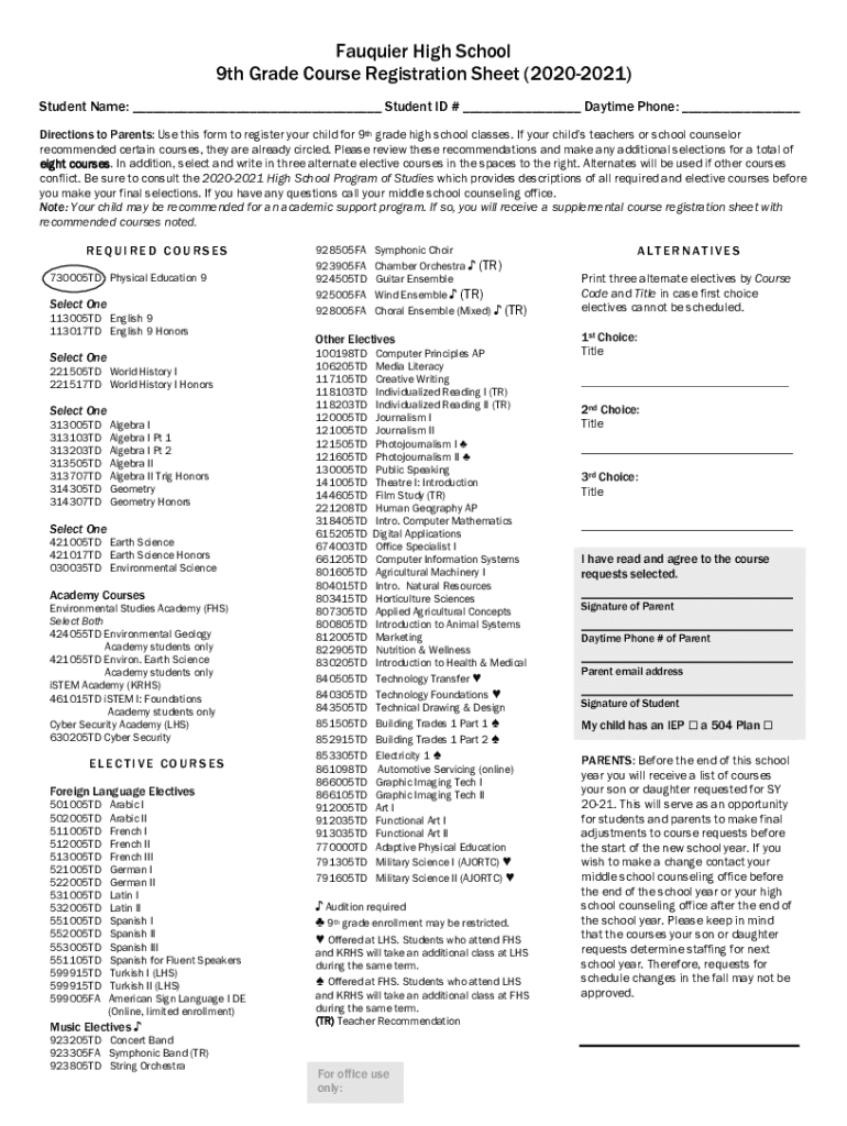 Faultier High School 9th Grade Course Registration Sheet (20202021) Student Name: ___ Student ID # ___ Daytime Phone: ___ Directions to Parents: Use this form to register your child for 9th grade