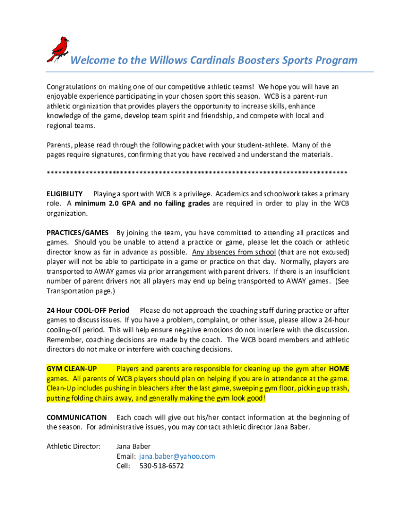 Welcome to the Willows Cardinals Boosters Sports Program Congratulations on making one of our competitive athletic teams! We hope you will have an enjoyable experience participating in your chosen