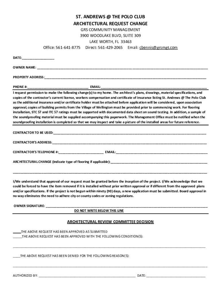 ST. ANDREWS @ THE POLO CLUB ARCHITECTURAL REQUEST CHANGE GRS COMMUNITY MANAGEMENT 3900 WOODLAND BLVD, SUITE 309 LAKE WORTH, FL 33463 Office: 5616418775 Direct: 5614292065 Email: cbennis@grsmgt.com