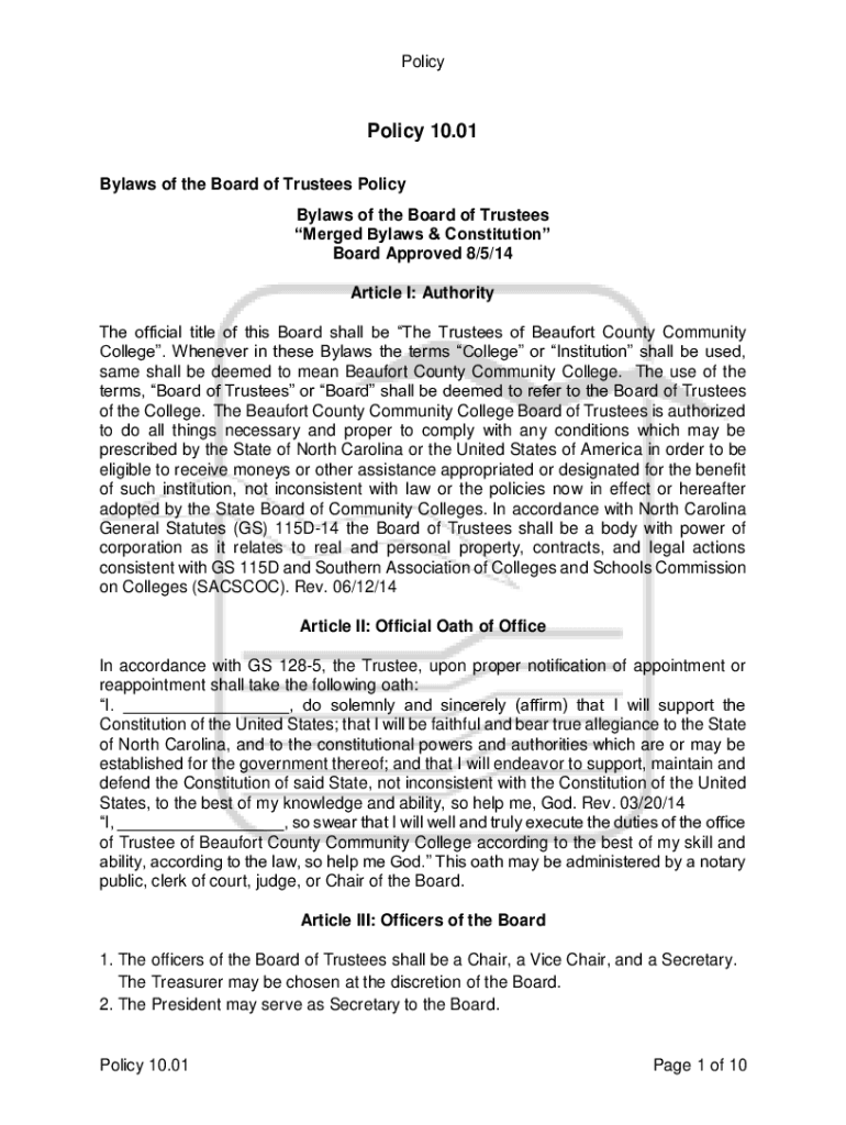 PolicyPolicy 10.01 Bylaws of the Board of Trustees Policy Bylaws of the Board of Trustees Merged Bylaws & Constitution Board Approved 8/5/14 Article I: Authority The official title of this Board shall