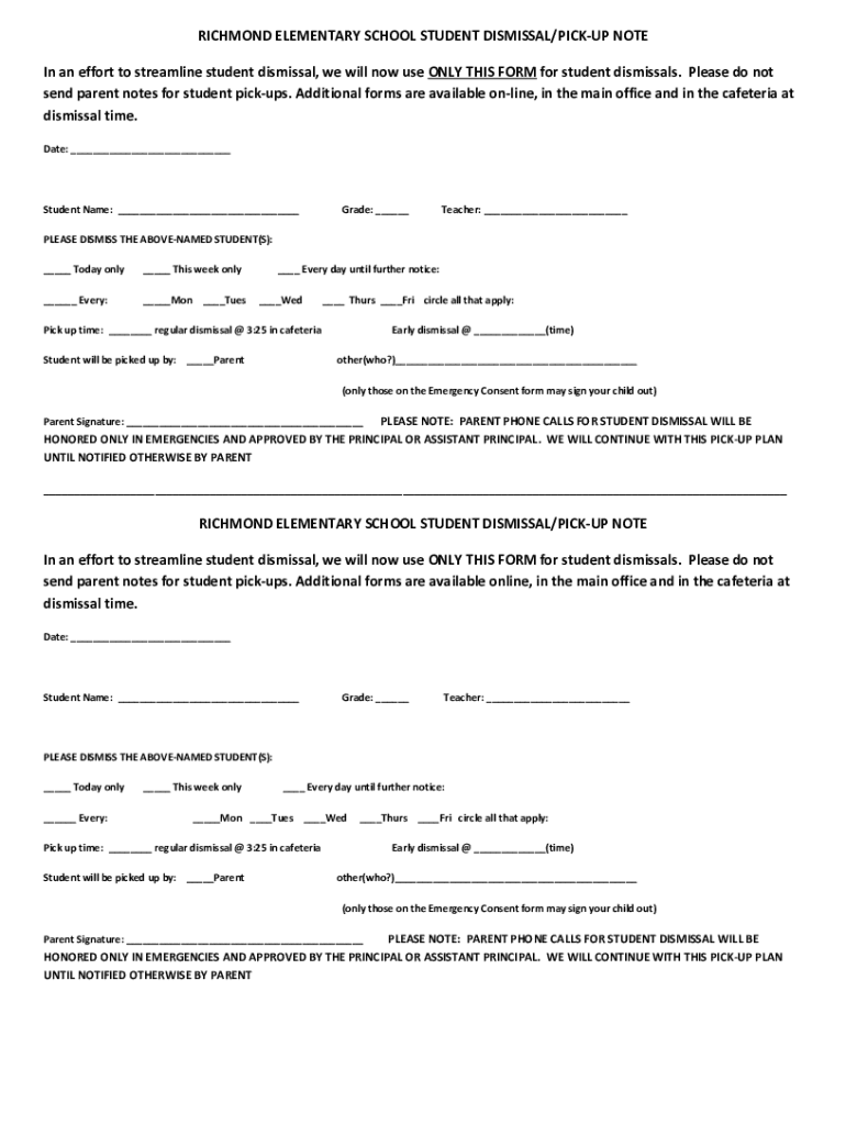 Get the free richmond elementary school student dismissal/pick-up note