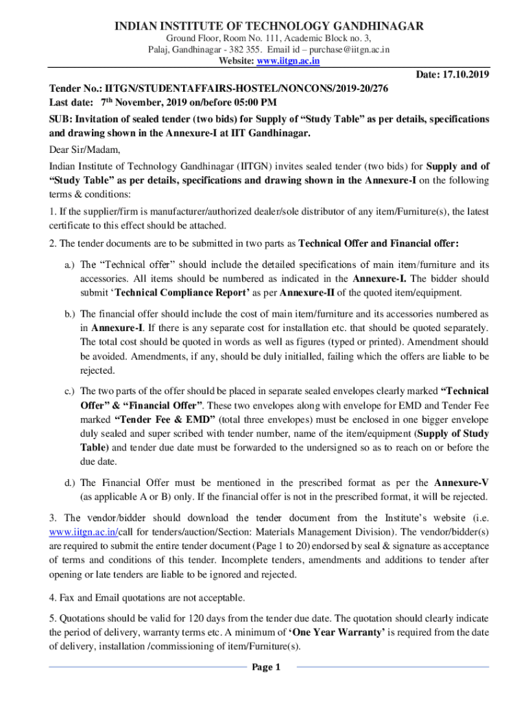 INDIAN INSTITUTE OF TECHNOLOGY GANDHINAGAR First Floor, Room No. 111, Academic Block no. 3, Paley, Gandhinagar 382 355. Email id purchase@iitgn.ac.in Website: www.iitgn.ac.inDate: 17.10.2019 Tender