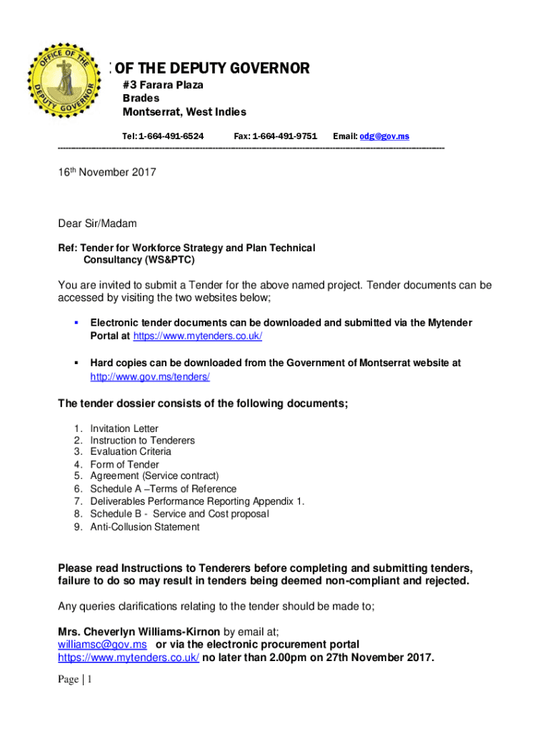 OFFICE OF THE DEPUTY GOVERNOR #3 Barbara Plaza Grades Montserrat, West Indies Tel: 16644916524Fax: 16644919751Email: OpenGov.ms16th November 2017Dear Sir/Madam Ref: Tender for Workforce Strategy and