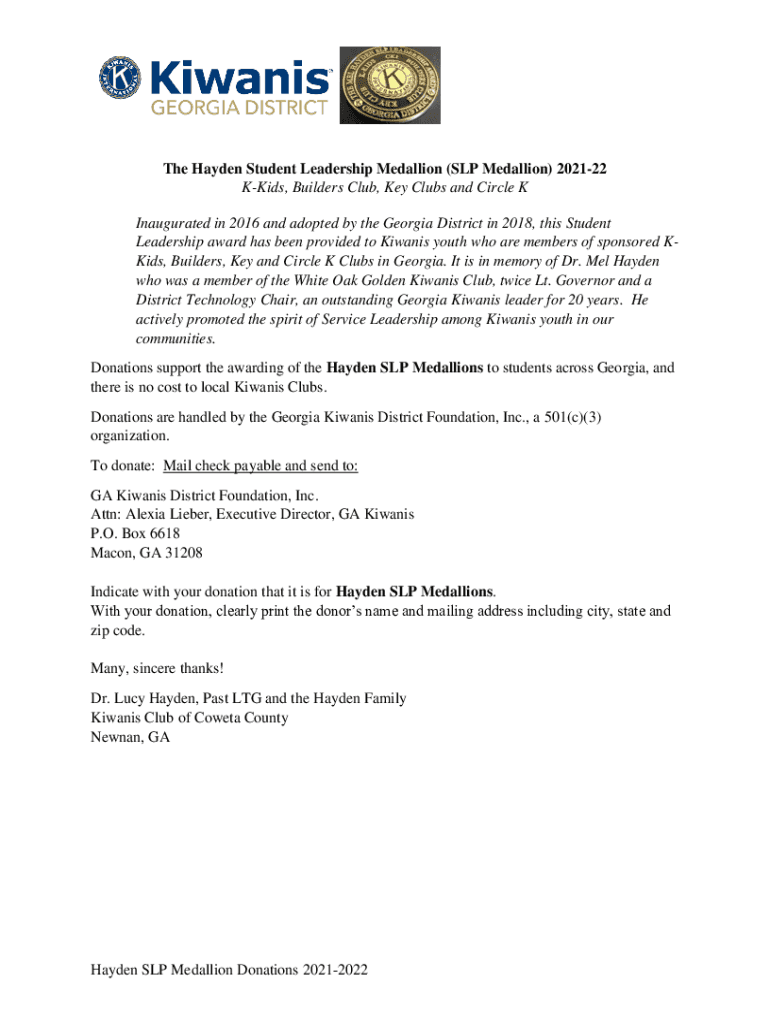 The Hayden Student Leadership Medallion (SLP Medallion) 202122 Kids, Builders Club, Key Clubs and Circle K Inaugurated in 2016 and adopted by the Georgia District in 2018, this Student Leadership